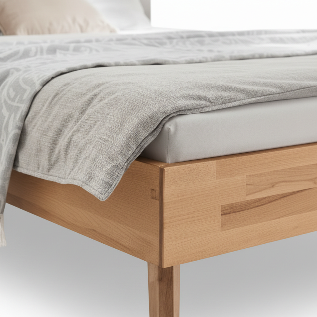 The natural finish emphasises the warm tone and grain pattern of core beech wood. This appearance allows the bed frame to integrate into various interior styles, including modern, minimalist, or natural wood-focused bedroom designs.
