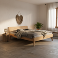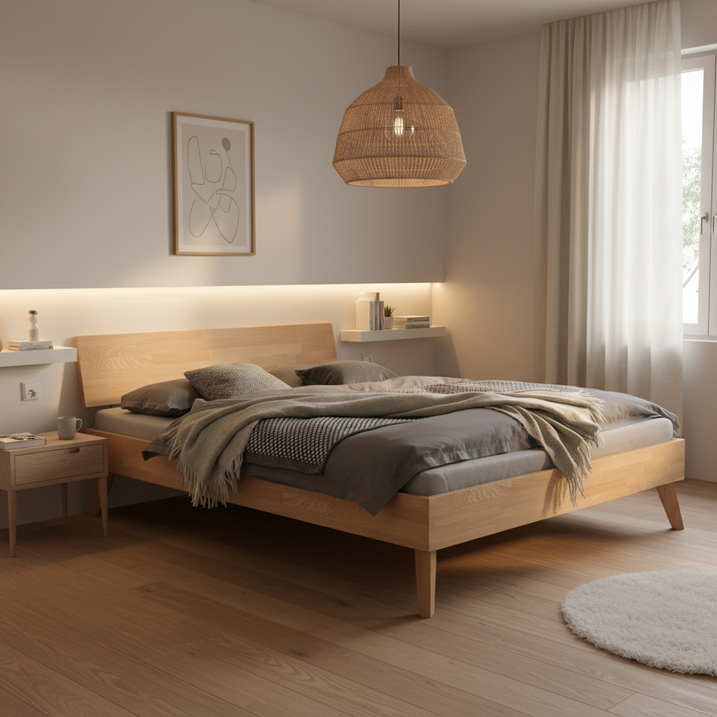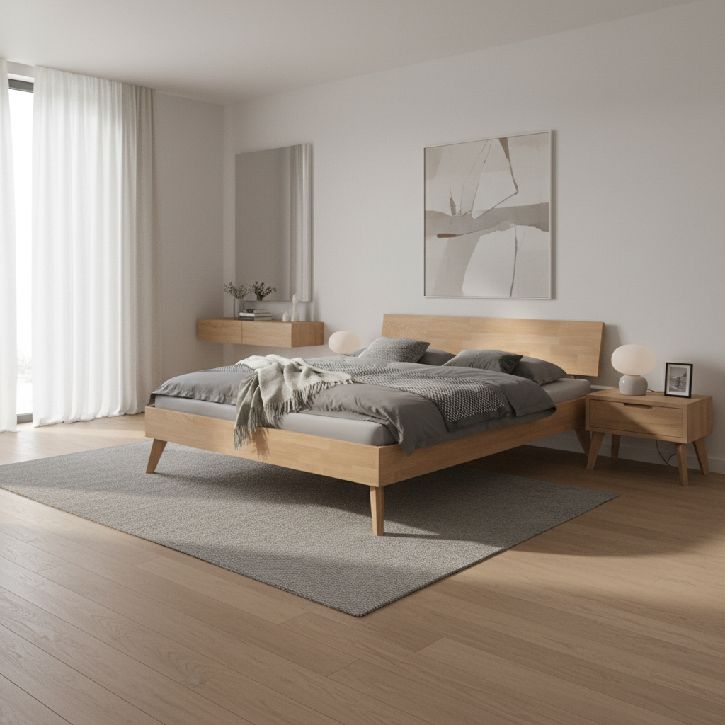 The natural oak finish emphasises the warm tone and distinctive grain pattern of the wood. This appearance allows the bed frame to integrate into a variety of interior styles, including modern, Scandinavian, or natural wood-focused bedroom designs.