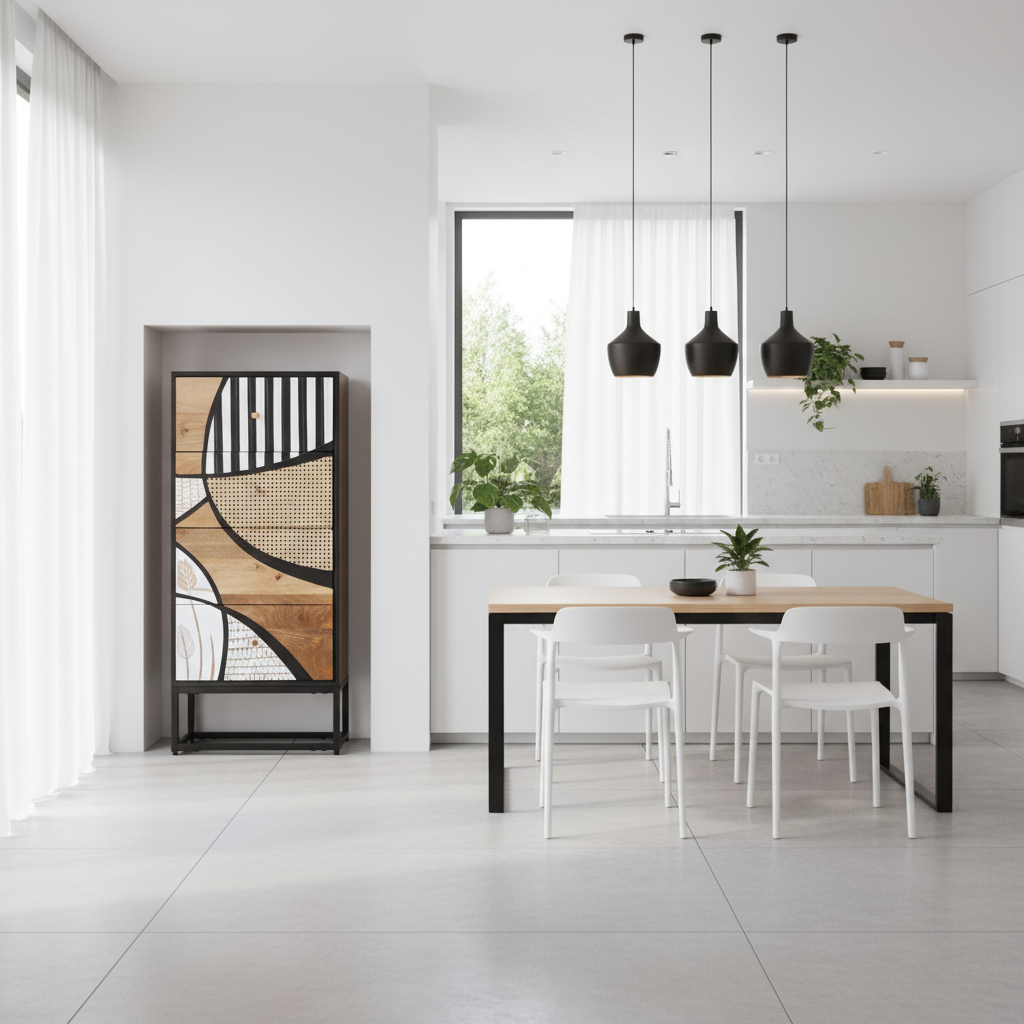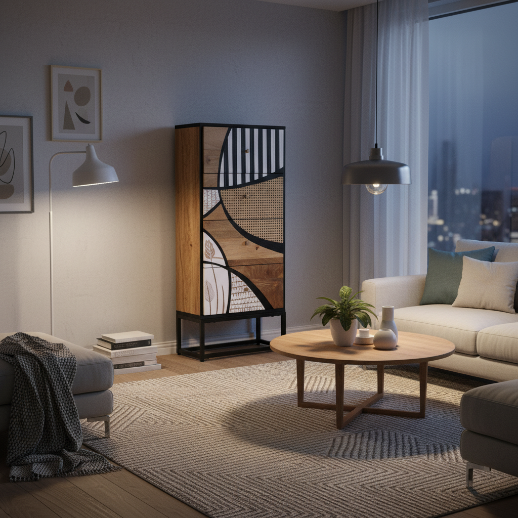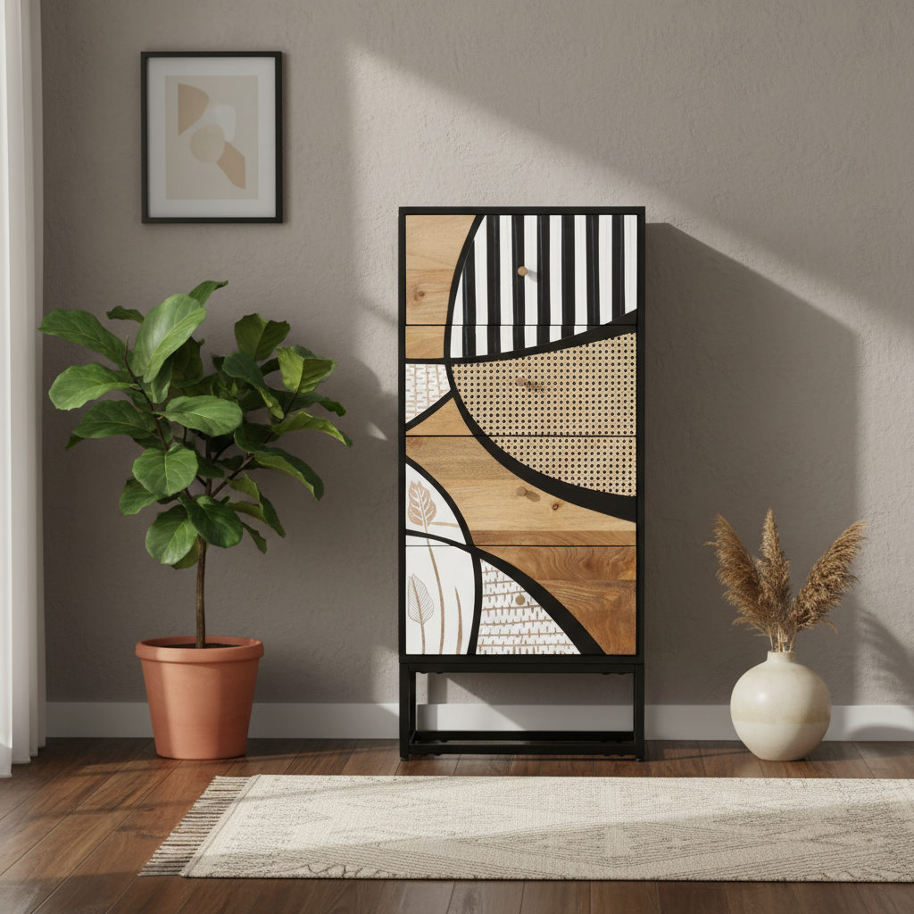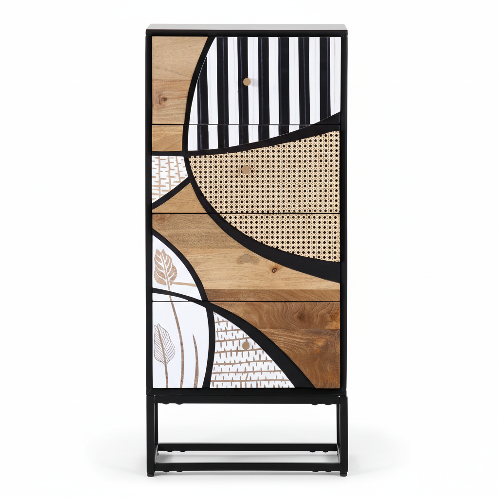 The furniture is constructed from solid mango wood with a stained and lacquered surface. The design combines black tones with multicolour front elements, creating contrast while preserving the natural grain characteristics of the wood. The surface treatment supports durability for everyday indoor use.
