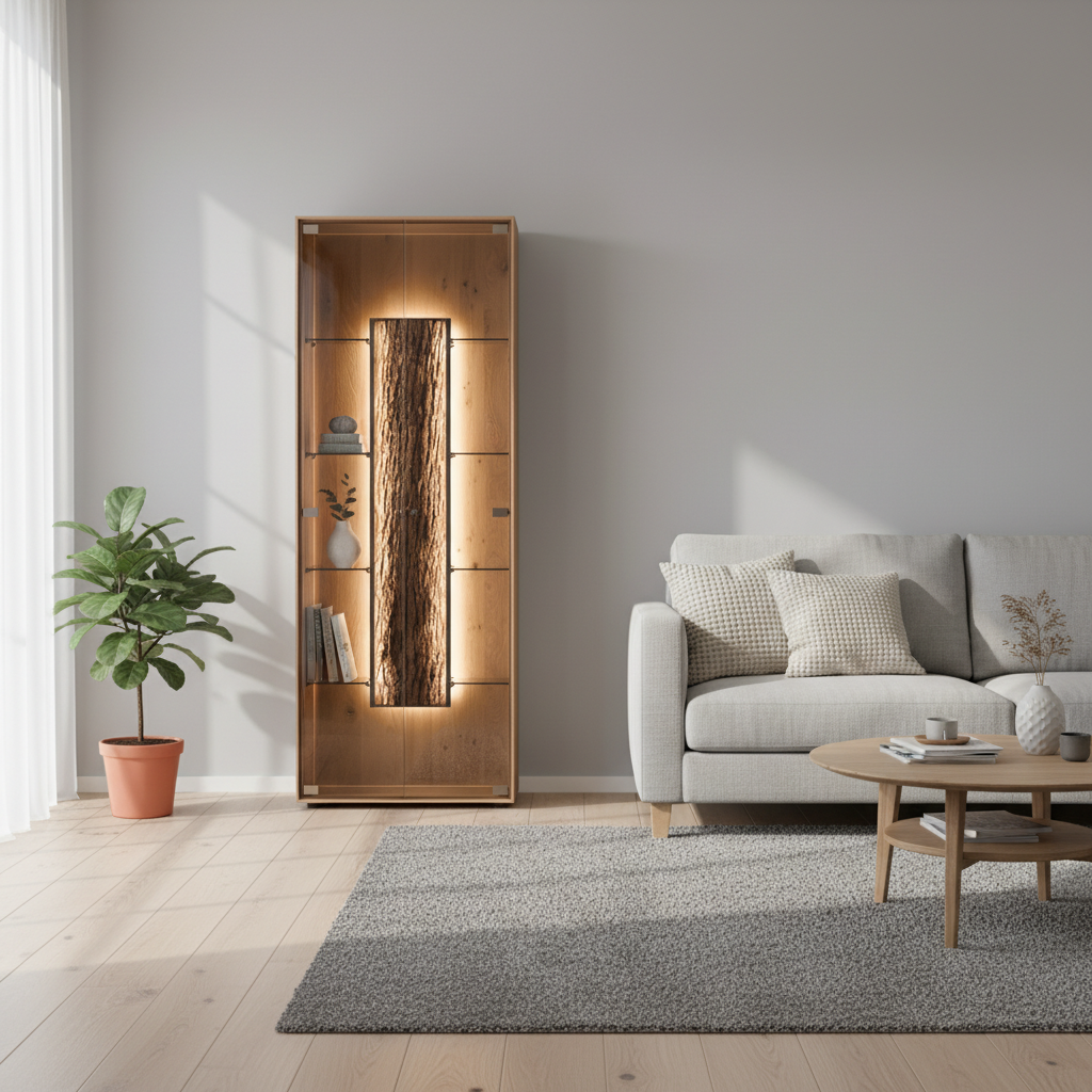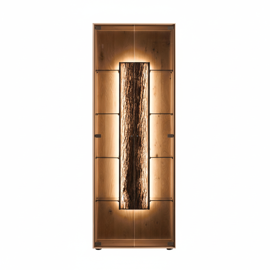 This display cabinet is designed for indoor residential use and features a core oak construction with natural bark detailing. The tall vitrine format supports both storage and display, making it suitable for living rooms or dining areas.