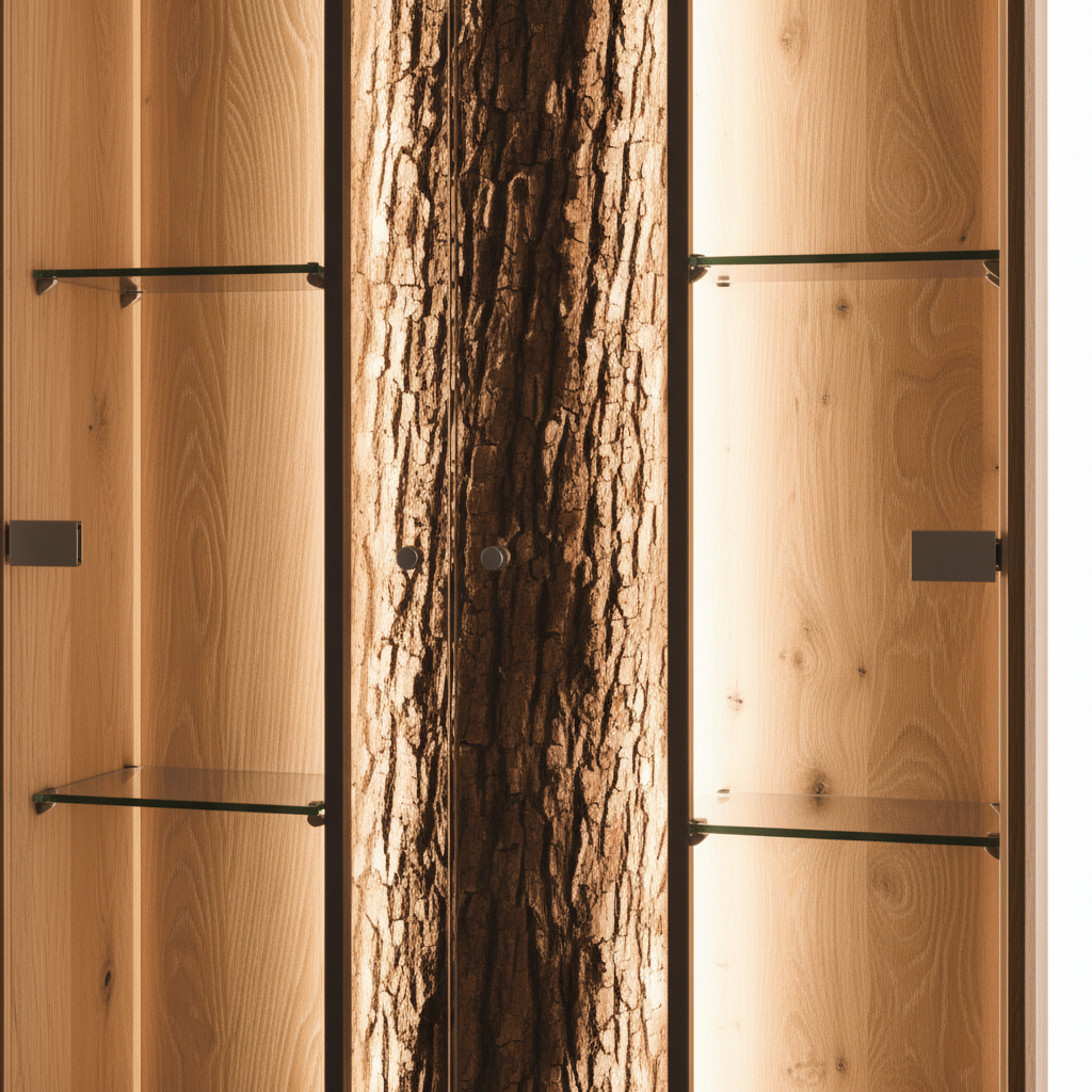 The cabinet is manufactured using core oak elements combined with wood-based components. Natural bark accents are incorporated into selected sections, highlighting the organic character of the wood and creating individual visual variation.