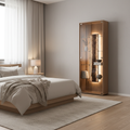 The vertical cabinet design makes efficient use of floor space while offering multiple internal storage levels. The unit is intended for free-standing placement against a wall.
