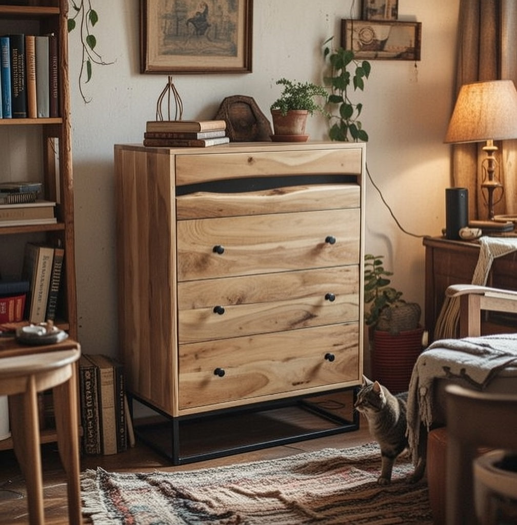 This dresser cabinet is made from solid wood with hand-crafted details and a simple, modern design.