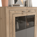 This highboard is designed for indoor residential use and features a wood-based construction with an oak grey surface finish. The cabinet combines enclosed storage with clear glass elements, making it suitable for living rooms or dining areas where both storage and display are required.