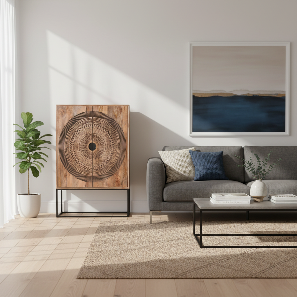This highboard is designed for indoor residential use and is manufactured from solid mango wood with a black surface finish. The vertical format provides generous enclosed storage while maintaining a balanced footprint, making it suitable for living rooms, dining areas, or home offices.