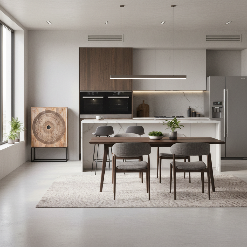 The highboard offers enclosed storage space suitable for tableware, documents, or household accessories. Its upright design supports efficient use of vertical space and helps keep items organised and easily accessible. The top surface may be used for decorative objects or additional storage.