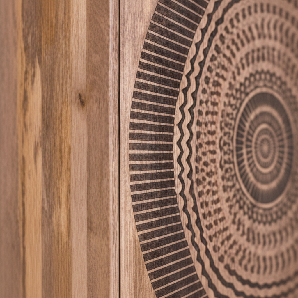 The furniture is constructed from solid mango wood with a black-stained and lacquered finish. The surface treatment enhances durability while highlighting the natural grain structure of the wood beneath the dark finish. The materials are selected for long-term indoor use.