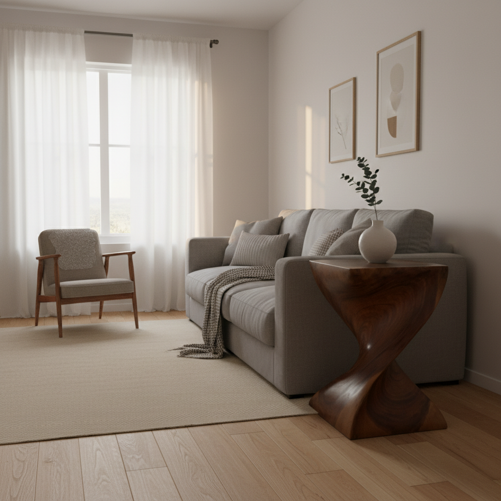 This side table is designed for indoor residential use and is constructed from solid suar wood. The compact rectangular format makes it suitable for use as a side table, accent table, or small occasional table in living rooms or bedrooms.