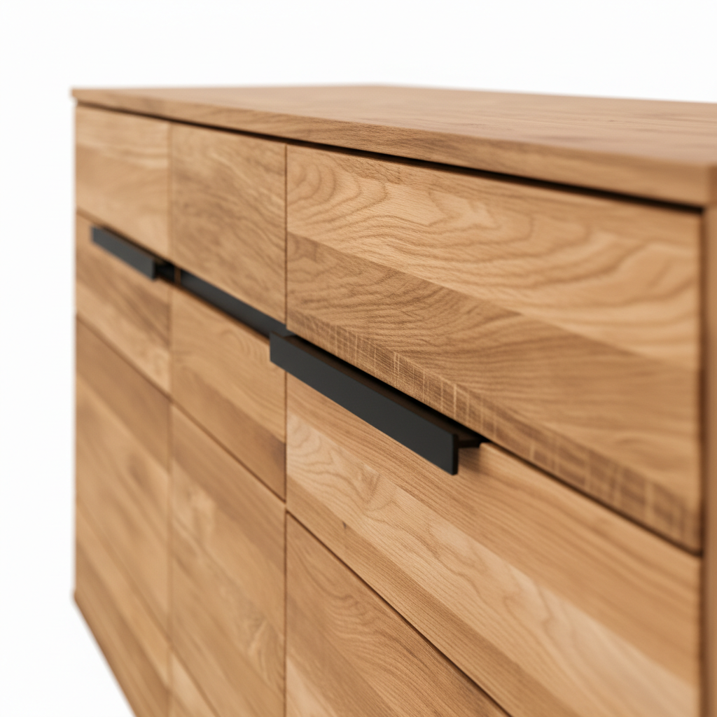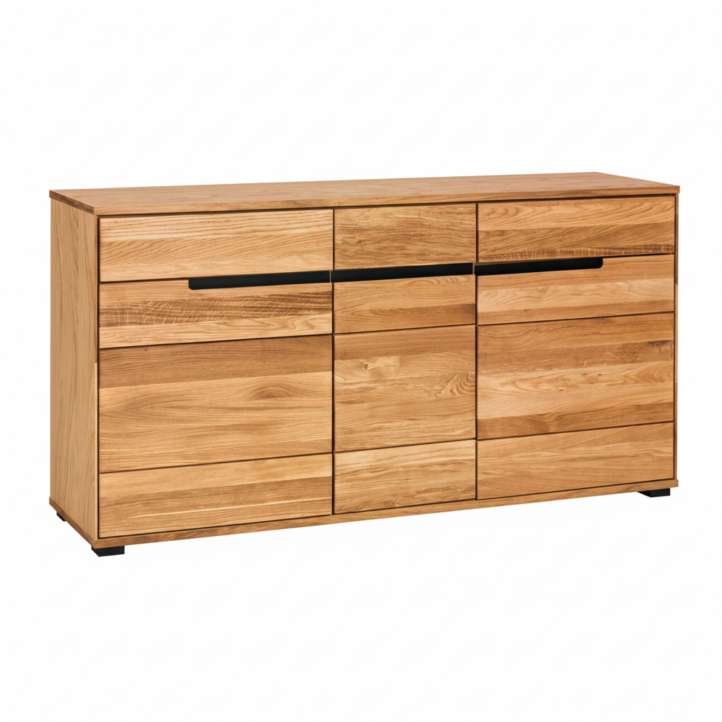 The sideboard is manufactured using a combination of solid oak elements and wood-based components. This construction highlights natural oak grain characteristics while supporting stable everyday indoor use.