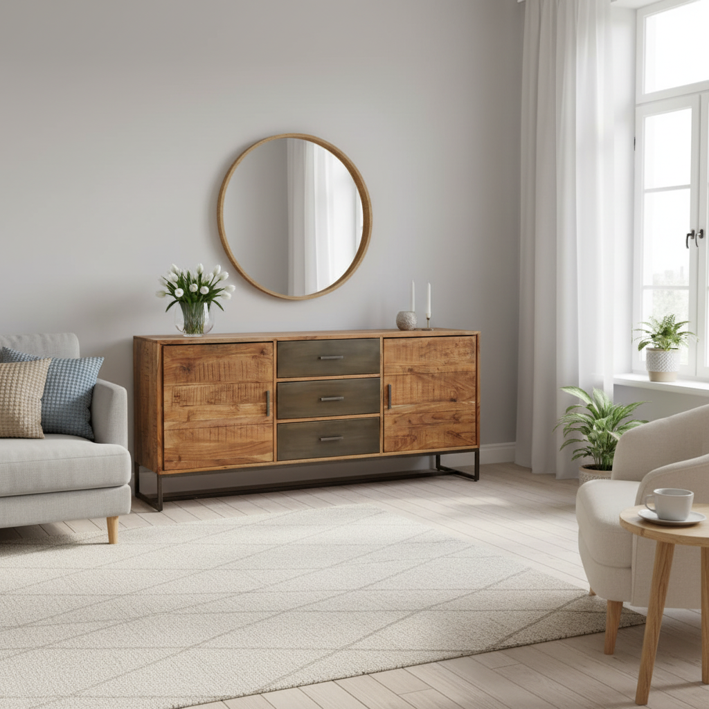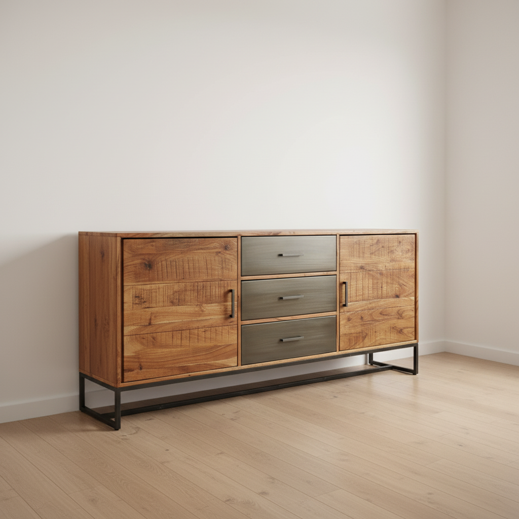 This sideboard is designed for indoor residential use and combines solid acacia wood with an iron supporting frame. The wide proportions and balanced height provide functional storage while maintaining a structured appearance suitable for living rooms, dining areas, or hallways.