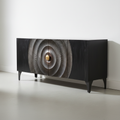 The sideboard is constructed from solid acacia wood with a black-stained and lacquered surface finish. The supporting frame is made from powder-coated iron, contributing to structural stability and a clearly defined outline. The materials are selected for durability and suitability for everyday indoor use.