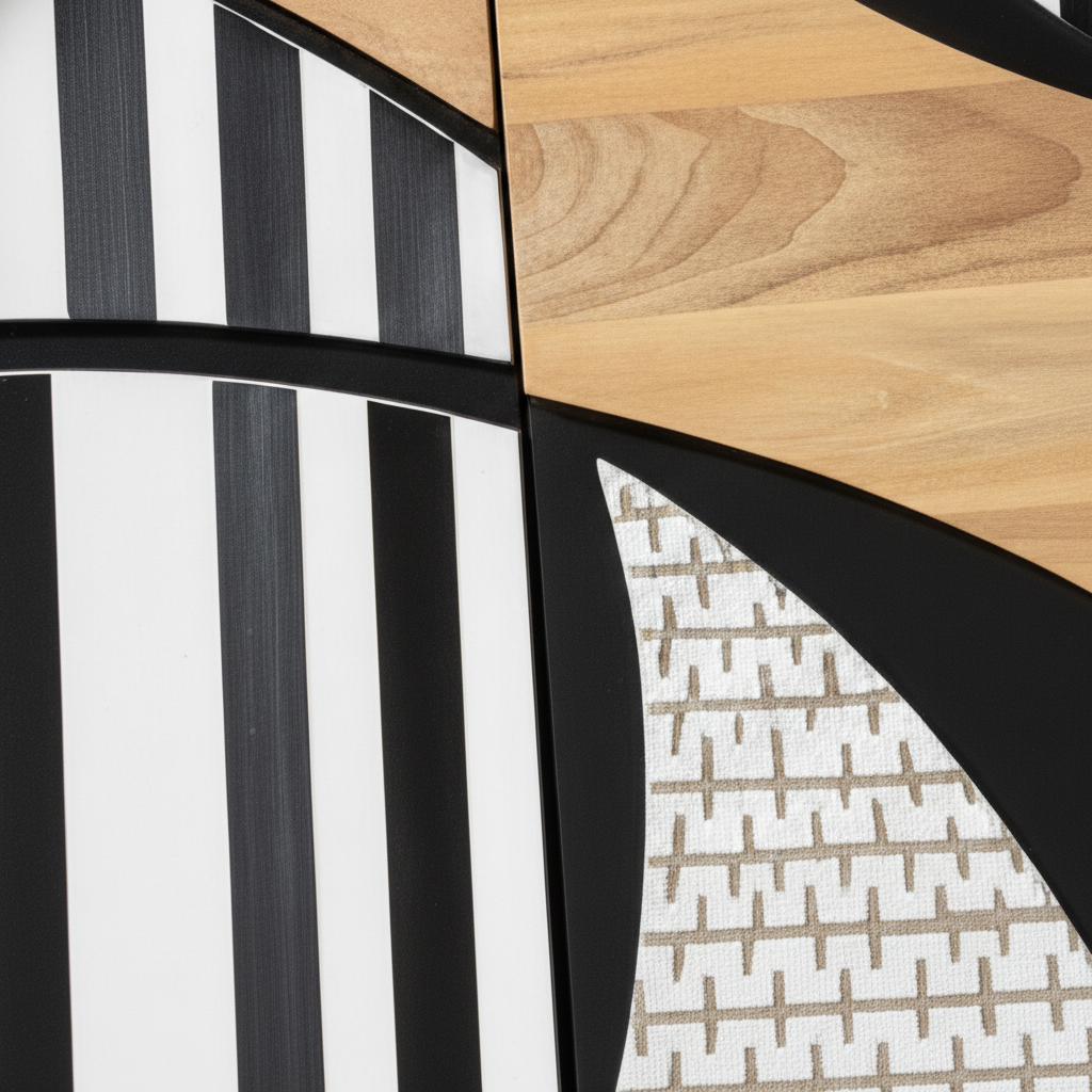 The sideboard is constructed from solid mango wood with a mix of natural and black-stained finishes. Selected front elements incorporate contrasting colour treatments and woven-style detailing. The supporting frame is made from powder-coated metal, providing structural stability and visual contrast.
