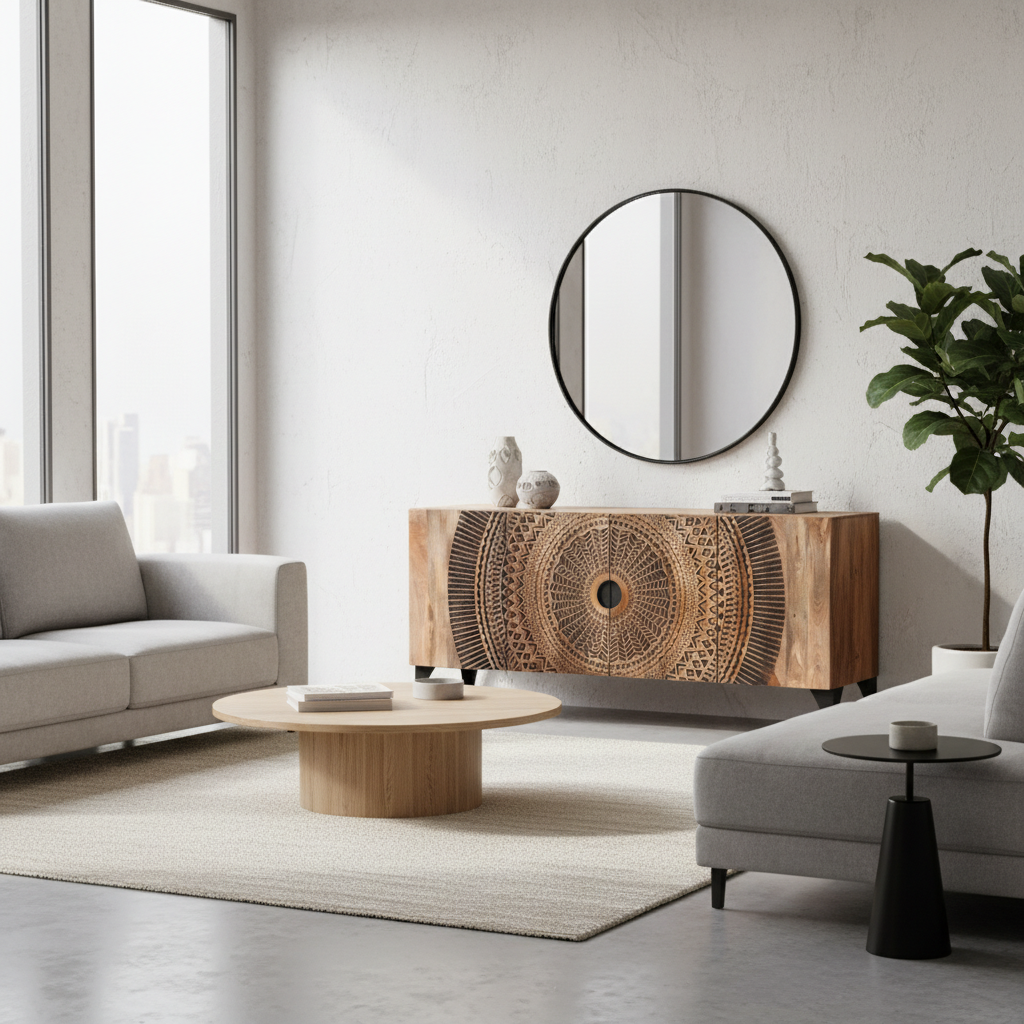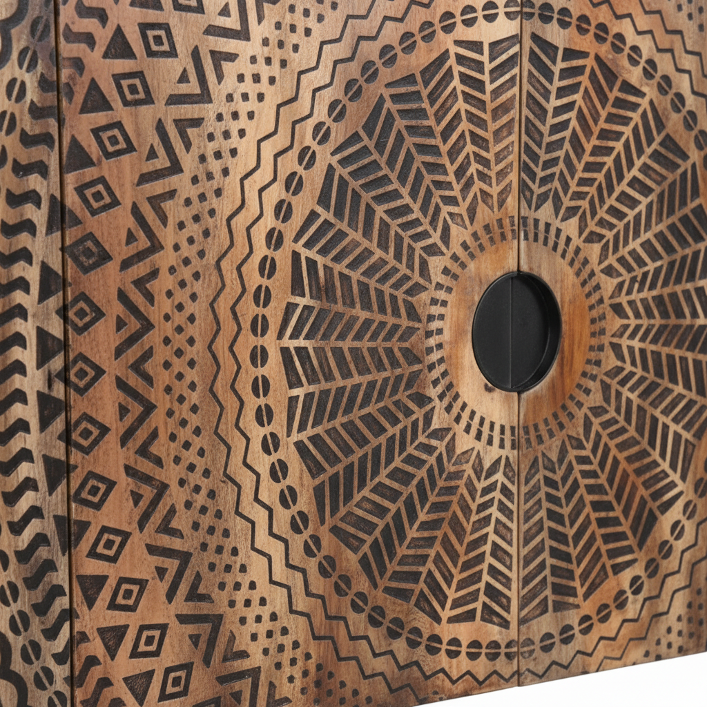 The cabinet body is made from solid mango wood, providing a stable structure for everyday household use. Natural wood grain characteristics remain visible beneath the surface finish, resulting in individual variations in appearance.