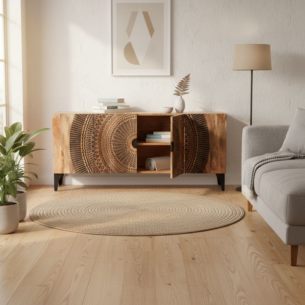 This sideboard is designed for indoor residential use and is constructed from solid mango wood. The wide cabinet format and dark surface finish make it suitable for living rooms, dining areas, or hallway storage where organised enclosed storage is required.