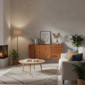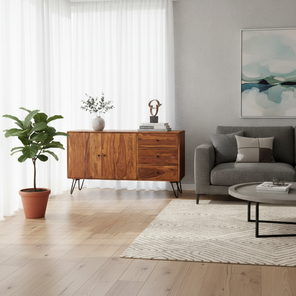 With its balanced proportions, the sideboard provides functional storage while remaining suitable for placement against a wall. The free-standing design supports flexible positioning within residential interiors.