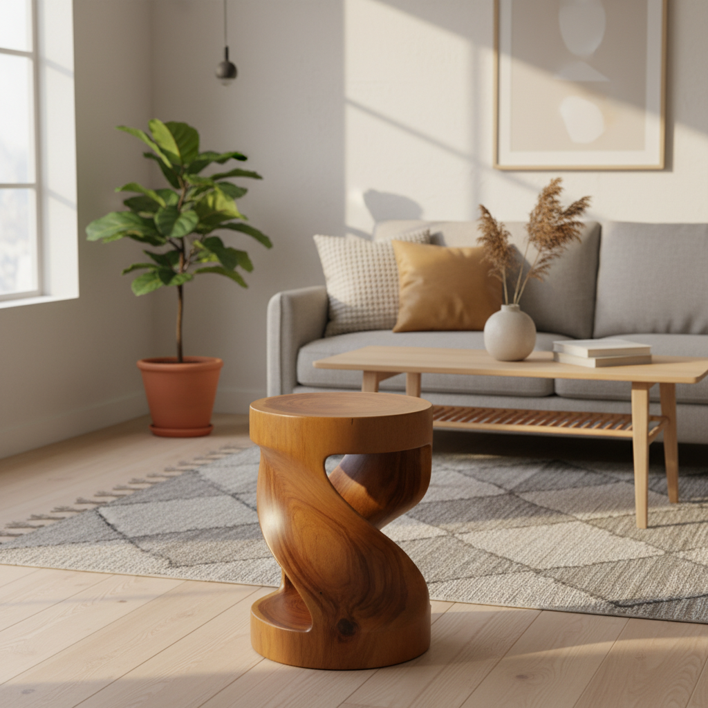 This stool is designed for indoor residential use and is constructed from solid suar wood. The compact round form makes it suitable for use as a seating stool, side stool, or decorative accent in living rooms, bedrooms, or hallways.