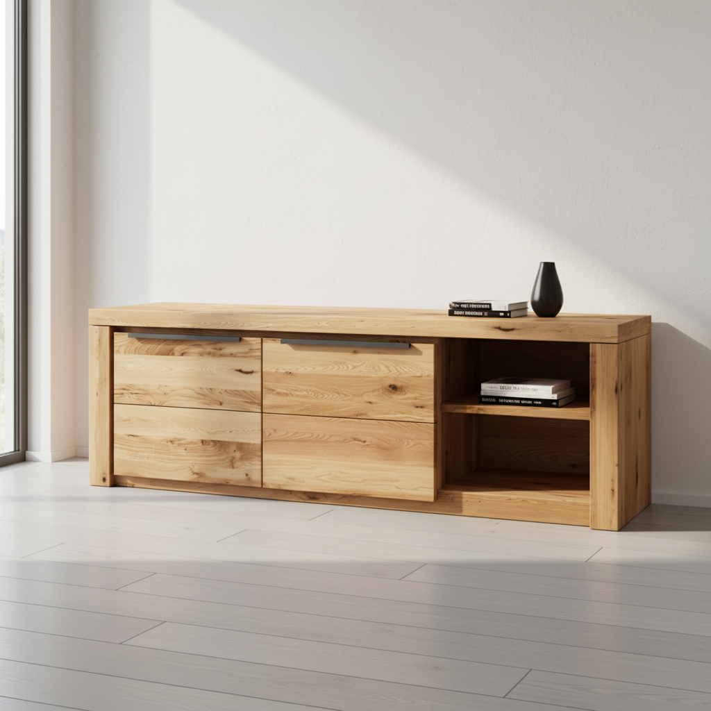 This TV unit is designed for indoor residential use and features a natural oiled oak finish with a part-solid wood construction. Its low-profile format makes it suitable for living rooms or media areas, providing structured storage while maintaining a natural and understated appearance.