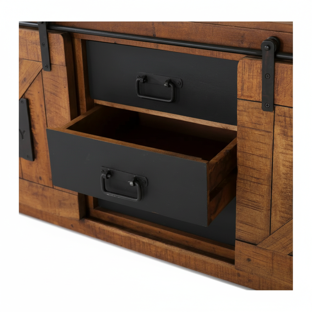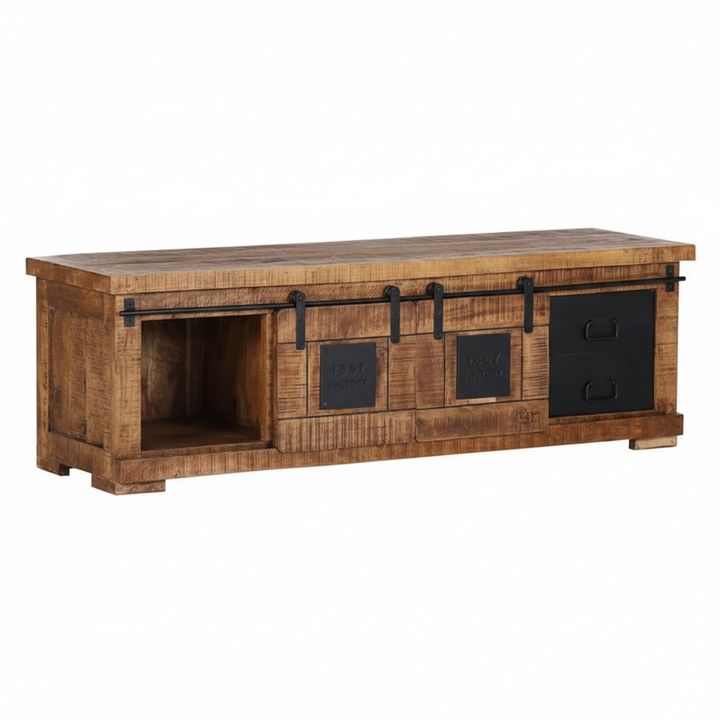 This TV unit is designed for indoor residential use and is constructed from solid mango wood. The low-profile cabinet format and dark surface finish make it suitable for living rooms or media areas requiring organised storage.