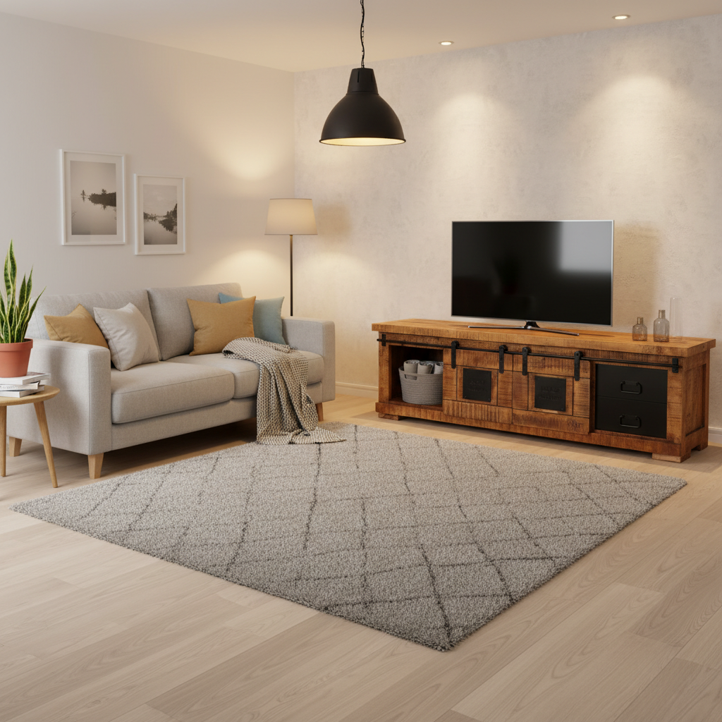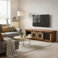 The lowboard format provides space for media equipment, accessories, or decorative items. The wide top surface supports placement of televisions or display objects, while enclosed storage helps keep items organised.